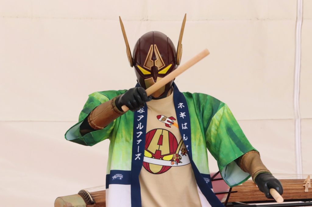 越谷アルファーズ マスコットキャラクター、宇宙からやってきたスーパーヒーロー・アルファマンが、太鼓をたたきに来てくれました!試合会場では、宙返りやブレイクダンスなど、かっこいい一面にとても驚かされました。